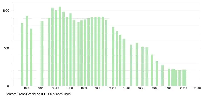 L'évolution du nombre d'habitants est connue à travers les recensements de la population effectués dans la commune depuis 1793. Pour les communes de moins de 10 000 habitants, une enquête de recensement portant sur toute la population est réalisée tous les cinq ans, les populations de référence des années intermédiaires étant quant à elles estimées par interpolation ou extrapolation[22]. Pour la commune, le premier recensement exhaustif entrant dans le cadre du nouveau dispositif a été réalisé en 2004[23].