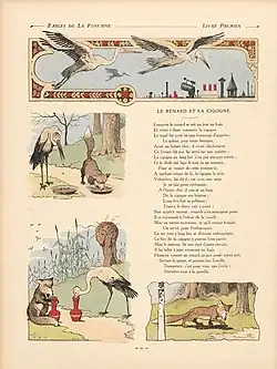 (2) le titre des éditions anciennes s'écrit "Le Renard et le Cicogne" (du latin cicogna) mais La Fontaine écrivait : "cicogne".