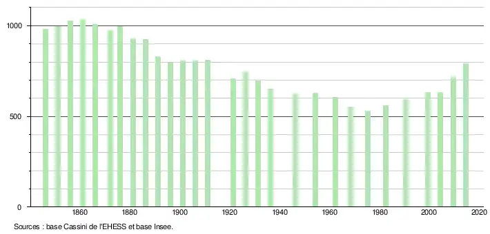 - ↑ Par convention dans Wikipédia, le principe a été retenu de n’afficher dans le tableau des recensements et le graphique, pour les populations légales postérieures à 1999, que les populations correspondant à une enquête exhaustive de recensement pour les communes de moins de 10 000 habitants, et que les populations des années 2006, 2011, 2016, etc. pour les communes de plus de 10 000 habitants, ainsi que la dernière population légale publiée par l’Insee pour l'ensemble des communes.