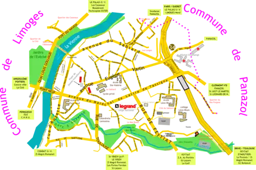 - l'avenue du Maréchal de Lattre de Tassigny, qui le relie au centre-ville à l'ouest et se prolonge par l'ex route nationale 141 à l'est vers Panazol et Clermont-Ferrand.