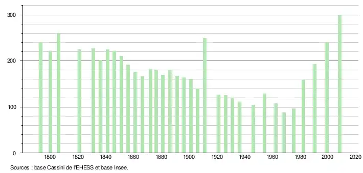 - ↑ Par convention dans Wikipédia, le principe a été retenu de n’afficher dans le tableau des recensements et le graphique, pour les populations légales postérieures à 1999, que les populations correspondant à une enquête exhaustive de recensement pour les communes de moins de 10 000 habitants, et que les populations des années 2006, 2011, 2016, etc. pour les communes de plus de 10 000 habitants, ainsi que la dernière population légale publiée par l’Insee pour l'ensemble des communes.
