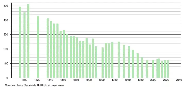 L'évolution du nombre d'habitants est connue à travers les recensements de la population effectués dans la commune depuis 1793. Pour les communes de moins de 10 000 habitants, une enquête de recensement portant sur toute la population est réalisée tous les cinq ans, les populations de référence des années intermédiaires étant quant à elles estimées par interpolation ou extrapolation[21]. Pour la commune, le premier recensement exhaustif entrant dans le cadre du nouveau dispositif a été réalisé en 2008[22].