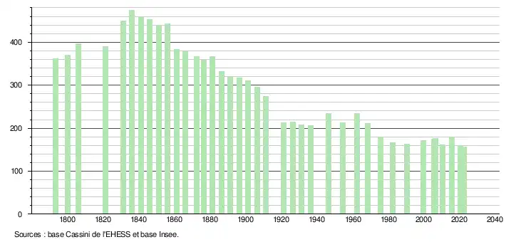 L'évolution du nombre d'habitants est connue à travers les recensements de la population effectués dans la commune depuis 1793. Pour les communes de moins de 10 000 habitants, une enquête de recensement portant sur toute la population est réalisée tous les cinq ans, les populations de référence des années intermédiaires étant quant à elles estimées par interpolation ou extrapolation[27]. Pour la commune, le premier recensement exhaustif entrant dans le cadre du nouveau dispositif a été réalisé en 2005[28].