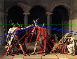 On observe que la règle des tiers a été parfaitement appliquée et centre ainsi le regard du spectateur sur le « tiers central » : les mains tendues des Horaces vers les glaives détenus par le père ; l’accent est mis sur le serment prêté.