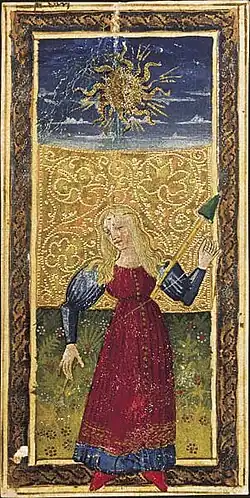 Sur la carte enluminée des trionfi de Visconti-Sforza, le Soleil apparaît comme un enfant ailé qui tient le luminaire resplendissant dans sa main.