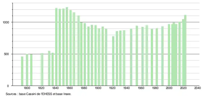 L'évolution du nombre d'habitants est connue à travers les recensements de la population effectués dans la commune depuis 1793. Pour les communes de moins de 10 000 habitants, une enquête de recensement portant sur toute la population est réalisée tous les cinq ans, les populations de référence des années intermédiaires étant quant à elles estimées par interpolation ou extrapolation[27]. Pour la commune, le premier recensement exhaustif entrant dans le cadre du nouveau dispositif a été réalisé en 2004[28].