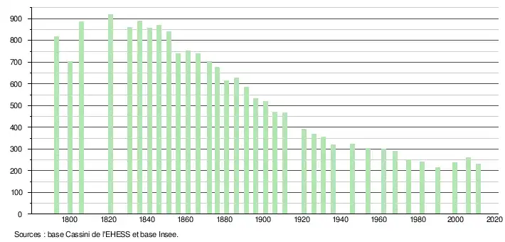 - ↑ Dans le tableau des recensements et le graphique, par convention dans Wikipédia, le principe a été retenu, pour les populations légales postérieures à 1999 de n’afficher dans le tableau des recensements et le graphique que les populations correspondant à l'année 2006, première population légale publiée calculée conformément aux concepts définis dans le décret no 2003-485 du 5 juin 2003, et les années correspondant à une enquête exhaustive de recensement pour les communes de moins de 10 000 habitants, ainsi que la dernière population légale publiée par l’Insee.