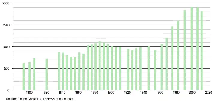 - ↑ Dans le tableau des recensements et le graphique, par convention dans Wikipédia, le principe a été retenu, pour les populations légales postérieures à 1999 de n’afficher dans le tableau des recensements et le graphique que les populations correspondant à l'année 2006, première population légale publiée calculée conformément aux concepts définis dans le décret no 2003-485 du 5 juin 2003, et les années correspondant à une enquête exhaustive de recensement pour les communes de moins de 10 000 habitants, ainsi que la dernière population légale publiée par l’Insee.
