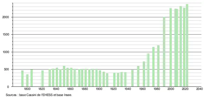 L'évolution du nombre d'habitants est connue à travers les recensements de la population effectués dans la commune depuis 1793. Pour les communes de moins de 10 000 habitants, une enquête de recensement portant sur toute la population est réalisée tous les cinq ans, les populations de référence des années intermédiaires étant quant à elles estimées par interpolation ou extrapolation[17]. Pour la commune, le premier recensement exhaustif entrant dans le cadre du nouveau dispositif a été réalisé en 2008[18].
