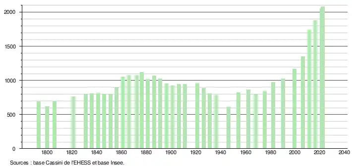 L'évolution du nombre d'habitants est connue à travers les recensements de la population effectués dans la commune depuis 1793. Pour les communes de moins de 10 000 habitants, une enquête de recensement portant sur toute la population est réalisée tous les cinq ans, les populations de référence des années intermédiaires étant quant à elles estimées par interpolation ou extrapolation[18]. Pour la commune, le premier recensement exhaustif entrant dans le cadre du nouveau dispositif a été réalisé en 2006[19].