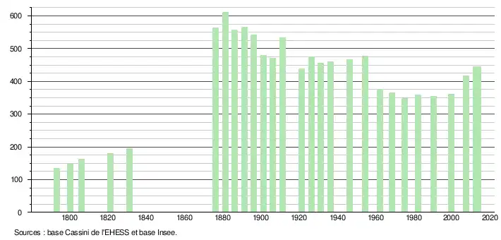 L'évolution du nombre d'habitants est connue à travers les recensements de la population effectués dans la commune depuis 1793. À partir du , les populations légales des communes sont publiées annuellement dans le cadre d'un recensement qui repose désormais sur une collecte d'information annuelle, concernant successivement tous les territoires communaux au cours d'une période de cinq ans. Pour les communes de moins de 10 000 habitants, une enquête de recensement portant sur toute la population est réalisée tous les cinq ans, les populations légales des années intermédiaires étant quant à elles estimées par interpolation ou extrapolation[20]. Pour la commune, le premier recensement exhaustif entrant dans le cadre du nouveau dispositif a été réalisé en 2007[21],[Note 1].
