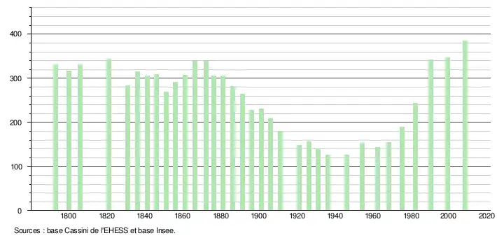 L'évolution du nombre d'habitants est connue à travers les recensements de la population effectués dans la commune depuis 1793. À partir du , les populations légales des communes sont publiées annuellement dans le cadre d'un recensement qui repose désormais sur une collecte d'information annuelle, concernant successivement tous les territoires communaux au cours d'une période de cinq ans. Pour les communes de moins de 10 000 habitants, une enquête de recensement portant sur toute la population est réalisée tous les cinq ans, les populations légales des années intermédiaires étant quant à elles estimées par interpolation ou extrapolation[6]. Pour la commune, le premier recensement exhaustif entrant dans le cadre du nouveau dispositif a été réalisé en 2008[7],[Note 1].