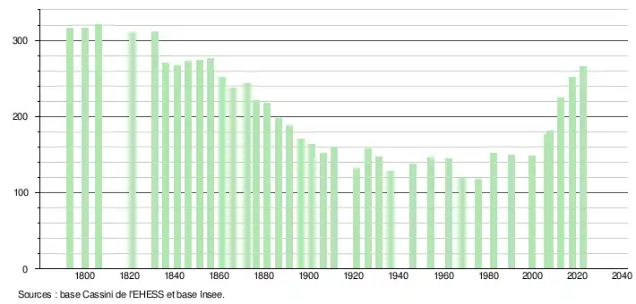 L'évolution du nombre d'habitants est connue à travers les recensements de la population effectués dans la commune depuis 1793. Pour les communes de moins de 10 000 habitants, une enquête de recensement portant sur toute la population est réalisée tous les cinq ans, les populations de référence des années intermédiaires étant quant à elles estimées par interpolation ou extrapolation[22]. Pour la commune, le premier recensement exhaustif entrant dans le cadre du nouveau dispositif a été réalisé en 2007[23].