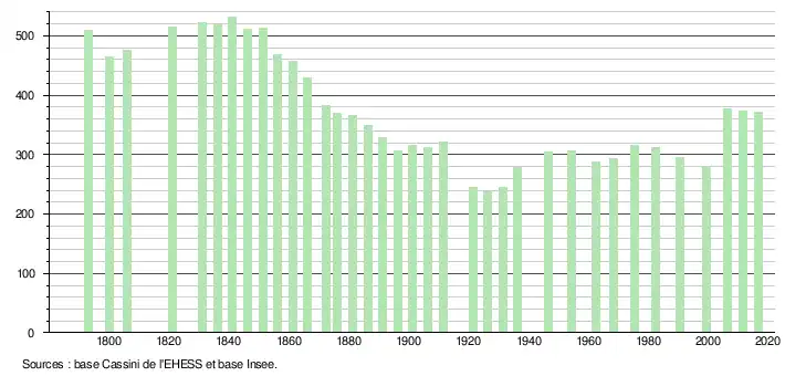 L'évolution du nombre d'habitants est connue à travers les recensements de la population effectués dans la commune depuis 1793. Pour les communes de moins de 10 000 habitants, une enquête de recensement portant sur toute la population est réalisée tous les cinq ans, les populations de référence des années intermédiaires étant quant à elles estimées par interpolation ou extrapolation[6]. Pour la commune, le premier recensement exhaustif entrant dans le cadre du nouveau dispositif a été réalisé en 2006[7].
