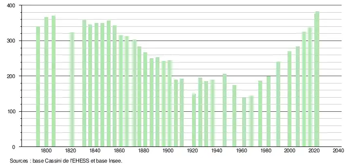 L'évolution du nombre d'habitants est connue à travers les recensements de la population effectués dans la commune depuis 1793. Pour les communes de moins de 10 000 habitants, une enquête de recensement portant sur toute la population est réalisée tous les cinq ans, les populations de référence des années intermédiaires étant quant à elles estimées par interpolation ou extrapolation[21]. Pour la commune, le premier recensement exhaustif entrant dans le cadre du nouveau dispositif a été réalisé en 2006[22].