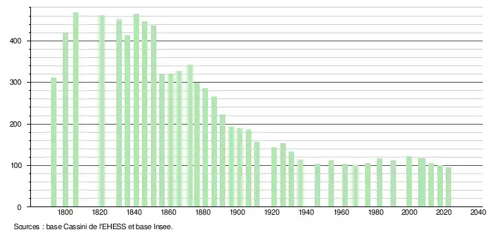 L'évolution du nombre d'habitants est connue à travers les recensements de la population effectués dans la commune depuis 1793. Pour les communes de moins de 10 000 habitants, une enquête de recensement portant sur toute la population est réalisée tous les cinq ans, les populations de référence des années intermédiaires étant quant à elles estimées par interpolation ou extrapolation[17]. Pour la commune, le premier recensement exhaustif entrant dans le cadre du nouveau dispositif a été réalisé en 2007[18].
