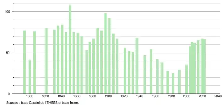 L'évolution du nombre d'habitants est connue à travers les recensements de la population effectués dans la commune depuis 1793. Pour les communes de moins de 10 000 habitants, une enquête de recensement portant sur toute la population est réalisée tous les cinq ans, les populations de référence des années intermédiaires étant quant à elles estimées par interpolation ou extrapolation[29]. Pour la commune, le premier recensement exhaustif entrant dans le cadre du nouveau dispositif a été réalisé en 2004[30].