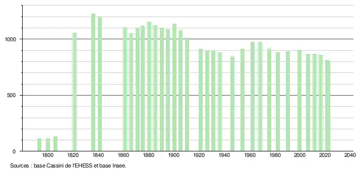 L'évolution du nombre d'habitants est connue à travers les recensements de la population effectués dans la commune depuis 1793. Pour les communes de moins de 10 000 habitants, une enquête de recensement portant sur toute la population est réalisée tous les cinq ans, les populations de référence des années intermédiaires étant quant à elles estimées par interpolation ou extrapolation[21]. Pour la commune, le premier recensement exhaustif entrant dans le cadre du nouveau dispositif a été réalisé en 2006[22].