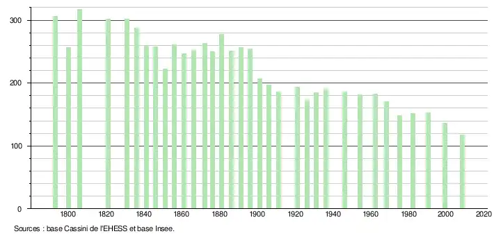 - ↑ Dans le tableau des recensements et le graphique, par convention dans Wikipédia, le principe a été retenu, pour les populations légales postérieures à 1999 de n’afficher dans le tableau des recensements et le graphique que les populations correspondant à l'année 2006, première population légale publiée calculée conformément aux concepts définis dans le décret no 2003-485 du 5 juin 2003, et les années correspondant à une enquête exhaustive de recensement pour les communes de moins de 10 000 habitants, ainsi que la dernière population légale publiée par l’Insee.