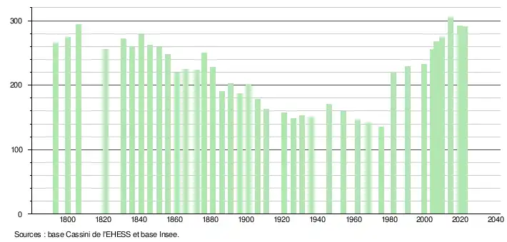 L'évolution du nombre d'habitants est connue à travers les recensements de la population effectués dans la commune depuis 1793. Pour les communes de moins de 10 000 habitants, une enquête de recensement portant sur toute la population est réalisée tous les cinq ans, les populations de référence des années intermédiaires étant quant à elles estimées par interpolation ou extrapolation[15]. Pour la commune, le premier recensement exhaustif entrant dans le cadre du nouveau dispositif a été réalisé en 2004[16].