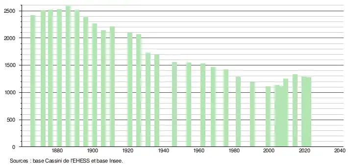L'évolution du nombre d'habitants est connue à travers les recensements de la population effectués dans la commune depuis 1866. Pour les communes de moins de 10 000 habitants, une enquête de recensement portant sur toute la population est réalisée tous les cinq ans, les populations de référence des années intermédiaires étant quant à elles estimées par interpolation ou extrapolation[25]. Pour la commune, le premier recensement exhaustif entrant dans le cadre du nouveau dispositif a été réalisé en 2004[26].