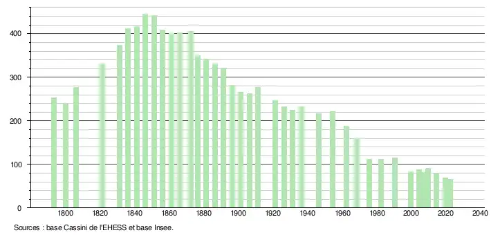 L'évolution du nombre d'habitants est connue à travers les recensements de la population effectués dans la commune depuis 1793. Pour les communes de moins de 10 000 habitants, une enquête de recensement portant sur toute la population est réalisée tous les cinq ans, les populations de référence des années intermédiaires étant quant à elles estimées par interpolation ou extrapolation[29]. Pour la commune, le premier recensement exhaustif entrant dans le cadre du nouveau dispositif a été réalisé en 2004[30].