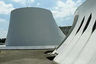 Pour l'historien de l'architecture William JR Curtis, Oscar Niemeyer appartient à la « seconde génération des architectes modernes ». Son style s'inspire des pionniers du modernisme comme Le Corbusier ou Mies van der Rohe mais a évolué en s'inspirant notamment de Pablo Picasso et Jean Arp mais aussi de l'héritage baroque du Brésil[6]. Oscar Niemeyer est influencé par Le Corbusier mais s'en démarque fortement notamment à travers son goût pour les courbes à l'opposé du style rigide et fonctionnel de Le Corbusier. Il considère qu'une œuvre architecturale doit être « belle et légère ». Dans un entretien avec Édouard Bailby, il explique : « Alors que l'angle droit sépare, divise, j'ai toujours aimé les courbes, qui sont l'essence même de la nature environnante ».