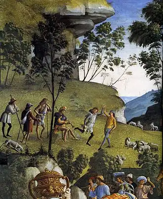 Le ciel est peuplé d'oiseaux, parmi lesquels deux s'accouplent en volant, faisant allusion au cycle de la Nature qui se renouvelle. Ce climat bucolique est aussi présent au second plan sur la gauche où un groupe de bergers danse, faisant allusion au fait que Moïse était devenu berger au service de Jethro. Les figures des femmes vêtues d'habits voletants, portant sur leurs têtes des vases et autres objets sont une représentation d'un motif typiquement florentin, utilisé par exemple aussi bien par Sandro Botticelli que par Domenico Ghirlandaio.