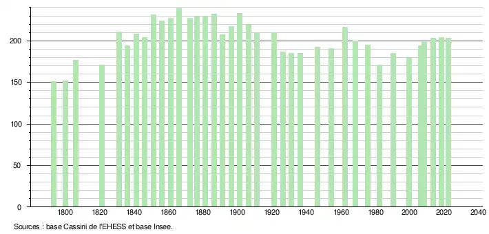 L'évolution du nombre d'habitants est connue à travers les recensements de la population effectués dans la commune depuis 1793. Pour les communes de moins de 10 000 habitants, une enquête de recensement portant sur toute la population est réalisée tous les cinq ans, les populations de référence des années intermédiaires étant quant à elles estimées par interpolation ou extrapolation[28]. Pour la commune, le premier recensement exhaustif entrant dans le cadre du nouveau dispositif a été réalisé en 2008[29].