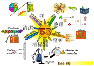 - le 5S : Les premières lettres de cinq termes japonais (seiri : trier, seiton : ranger, seiso : nettoyer, seiketsu : standardiser, shitsuke : respecter) qui ont pour objectif d'éliminer les causes de nombreux petits problèmes, sources de perte d'efficacité. C'est l'une des premières méthodes à mettre en œuvre dans une démarche de lean management. Elle vise aussi à changer la mentalité des opérateurs et de l'encadrement ;