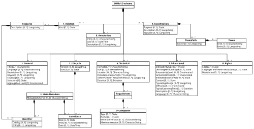 Le LOM comporte 9 catégories regroupant 68 éléments dont 10 sont composés et prévoit donc la documentation facultative de 58 champs. Parmi ces éléments, il est possible de retrouver l'information véhiculée par les quinze éléments du Dublin Core qui forment la norme ISO 15836 (2003).