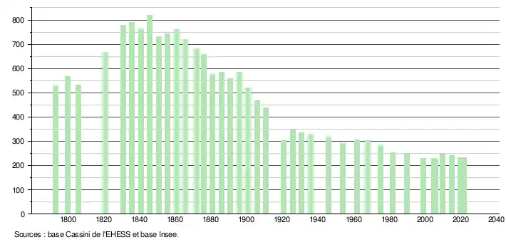 L'évolution du nombre d'habitants est connue à travers les recensements de la population effectués dans la commune depuis 1793. Pour les communes de moins de 10 000 habitants, une enquête de recensement portant sur toute la population est réalisée tous les cinq ans, les populations de référence des années intermédiaires étant quant à elles estimées par interpolation ou extrapolation[31]. Pour la commune, le premier recensement exhaustif entrant dans le cadre du nouveau dispositif a été réalisé en 2005[32].