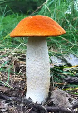 Le Bolet orangé des bouleaux (Leccinum versipelle) a un stipe couvert de mèches noires et vient surtout sous bouleaux. Comestible réputé.