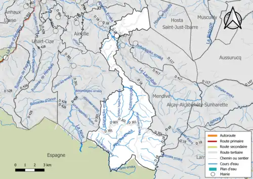 La commune est aussi arrosée par l'Irati[14] et par ses affluents, le ruisseau de Sourzay, Léherreko erreka, Oraatéko erreka, Patarbeltcheko erreka, Larreluchéko erreka, Arpiako erreka et Uthurkokotséko erreka.