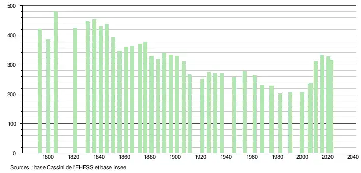L'évolution du nombre d'habitants est connue à travers les recensements de la population effectués dans la commune depuis 1793. Pour les communes de moins de 10 000 habitants, une enquête de recensement portant sur toute la population est réalisée tous les cinq ans, les populations de référence des années intermédiaires étant quant à elles estimées par interpolation ou extrapolation[33]. Pour la commune, le premier recensement exhaustif entrant dans le cadre du nouveau dispositif a été réalisé en 2005[34].