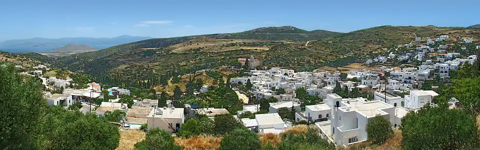 Situé à 200 m d'altitude, le village compte 519 habitants[2]. Il est construit sur les flancs de l'Aghion Pandon, le plus haut sommet de l'île[3]. Sa forme, en amphithéâtre, épouse celle de la montagne[4].