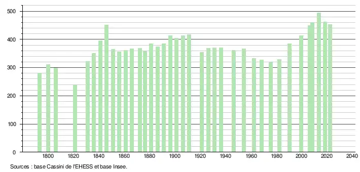 L'évolution du nombre d'habitants est connue à travers les recensements de la population effectués dans la commune depuis 1793. Pour les communes de moins de 10000habitants, une enquête de recensement portant sur toute la population est réalisée tous les cinqans, les populations de référence des années intermédiaires étant quant à elles estimées par interpolation ou extrapolation[27]. Pour la commune, le premier recensement exhaustif entrant dans le cadre du nouveau dispositif a été réalisé en 2008[28].