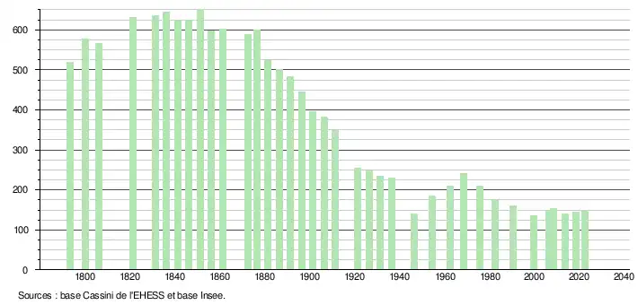 L'évolution du nombre d'habitants est connue à travers les recensements de la population effectués dans la commune depuis 1793. Pour les communes de moins de 10 000 habitants, une enquête de recensement portant sur toute la population est réalisée tous les cinq ans, les populations de référence des années intermédiaires étant quant à elles estimées par interpolation ou extrapolation[18]. Pour la commune, le premier recensement exhaustif entrant dans le cadre du nouveau dispositif a été réalisé en 2008[19].