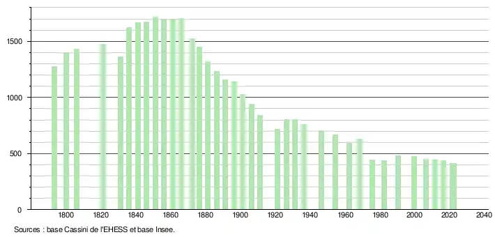 L'évolution du nombre d'habitants est connue à travers les recensements de la population effectués dans la commune depuis 1793. Pour les communes de moins de 10 000 habitants, une enquête de recensement portant sur toute la population est réalisée tous les cinq ans, les populations de référence des années intermédiaires étant quant à elles estimées par interpolation ou extrapolation[27]. Pour la commune, le premier recensement exhaustif entrant dans le cadre du nouveau dispositif a été réalisé en 2006[28].
