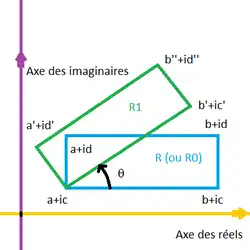 La démonstration sur un rectangle R1 quelconque est maladroite car multiplie le nombre de paramètres : deux pour chacun de ses sommets. Il est aisé de montrer qu'un rectangle quelconque est l'image par une rotation d'un rectangle R0 aux côtés parallèles aux axes des réels et des imaginaires. Un tel rectangle ne possède que 4 paramètres car l'affixe de chaque sommet partage avec celle de ses voisins soit sa partie réelle (abscisse) soit sa partie imaginaire (ordonnée), simplifiant le problème ; la démonstration qui suit est effectuée sur ce type de rectangle.