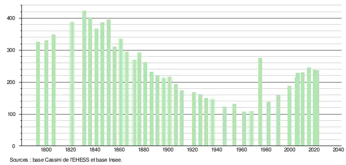 L'évolution du nombre d'habitants est connue à travers les recensements de la population effectués dans la commune depuis 1793. Pour les communes de moins de 10 000 habitants, une enquête de recensement portant sur toute la population est réalisée tous les cinq ans, les populations de référence des années intermédiaires étant quant à elles estimées par interpolation ou extrapolation[18]. Pour la commune, le premier recensement exhaustif entrant dans le cadre du nouveau dispositif a été réalisé en 2005[19].