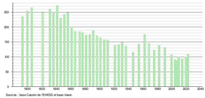 L'évolution du nombre d'habitants est connue à travers les recensements de la population effectués dans la commune depuis 1793. Pour les communes de moins de 10 000 habitants, une enquête de recensement portant sur toute la population est réalisée tous les cinq ans, les populations de référence des années intermédiaires étant quant à elles estimées par interpolation ou extrapolation[23]. Pour la commune, le premier recensement exhaustif entrant dans le cadre du nouveau dispositif a été réalisé en 2004[24].