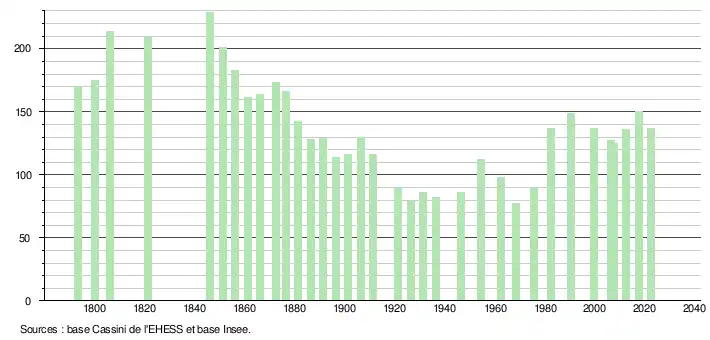 L'évolution du nombre d'habitants est connue à travers les recensements de la population effectués dans la commune depuis 1793. Pour les communes de moins de 10 000 habitants, une enquête de recensement portant sur toute la population est réalisée tous les cinq ans, les populations de référence des années intermédiaires étant quant à elles estimées par interpolation ou extrapolation[13]. Pour la commune, le premier recensement exhaustif entrant dans le cadre du nouveau dispositif a été réalisé en 2007[14].