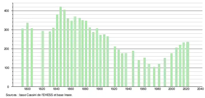 L'évolution du nombre d'habitants est connue à travers les recensements de la population effectués dans la commune depuis 1793. Pour les communes de moins de 10 000 habitants, une enquête de recensement portant sur toute la population est réalisée tous les cinq ans, les populations de référence des années intermédiaires étant quant à elles estimées par interpolation ou extrapolation[15]. Pour la commune, le premier recensement exhaustif entrant dans le cadre du nouveau dispositif a été réalisé en 2006[16].
