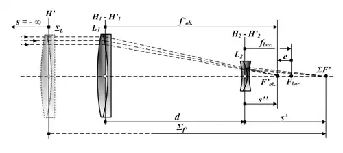 D'autre part, la position du foyer image du système par rapport au même plan principal de la lentille de Barlow est donnée par :