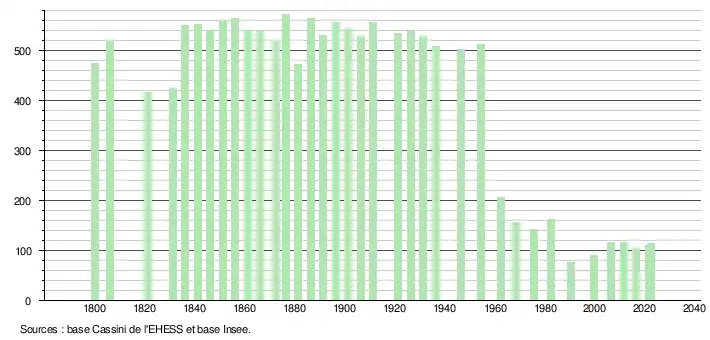 L'évolution du nombre d'habitants est connue à travers les recensements de la population effectués dans la commune depuis 1800. Pour les communes de moins de 10 000 habitants, une enquête de recensement portant sur toute la population est réalisée tous les cinq ans, les populations de référence des années intermédiaires étant quant à elles estimées par interpolation ou extrapolation[8]. Pour la commune, le premier recensement exhaustif entrant dans le cadre du nouveau dispositif a été réalisé en 2006[9].