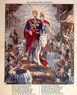 En 1893, la position de Caprivi est très affaiblie. Il n'a plus de majorité stable au parlement, la Prusse s'est transformée en contre-pouvoir. Dans l'opinion publique l'opposition de droite fait monter la colère contre le chancelier qui est de moins en moins soutenu par l'empereur. La chute du chancelier est provoquée par sa position vis-à-vis des sociaux-démocrates. Sous l'influence grandissante de Carl Ferdinand von Stumm-Halberg, l'empereur s'est détourné depuis longtemps de sa politique sociale initiale et finit par demander une loi contre les partis révolutionnaires[65]. Eulenburg annonce donc vouloir proposer une loi impériale sur les « tendances révolutionnaires ». Il est alors évident que le Reichstag ne donnera pas son aval. En conséquence, il devra être dissout et de nouvelles élections avoir lieu. On peut également prévoir que le nouveau parlement, pas plus que le premier ne votera la loi. Par la suite une nouvelle loi électorale permettant d'obtenir une majorité stable devra être votée. C'est du moins le plan prévu par le pouvoir. Il doit permettre de se débarrasser de Caprivi qui ne peut pas survivre au vote d'une loi semblable aux lois antisocialistes. De plus, Guillaume II fait de la lutte contre les partis révolutionnaires une affaire personnelle. Caprivi s'oppose à ces aspirations et propose sa démission.