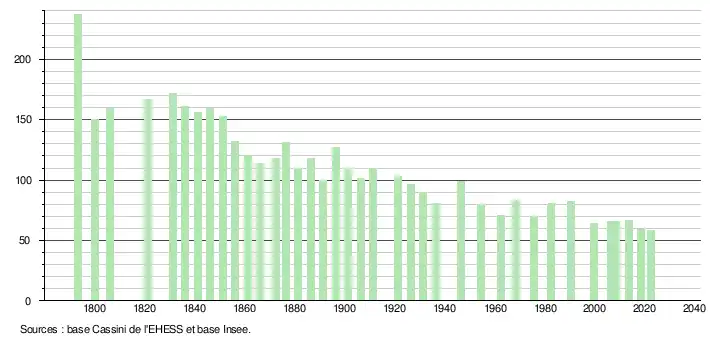 L'évolution du nombre d'habitants est connue à travers les recensements de la population effectués dans la commune depuis 1793. Pour les communes de moins de 10 000 habitants, une enquête de recensement portant sur toute la population est réalisée tous les cinq ans, les populations de référence des années intermédiaires étant quant à elles estimées par interpolation ou extrapolation[15]. Pour la commune, le premier recensement exhaustif entrant dans le cadre du nouveau dispositif a été réalisé en 2008[16].