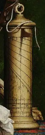 L'étagère supérieure comporte trois cadrans solaires également visibles sur le portrait de Nicolas Kratzer, que Holbein peint en 1528. Les deux hommes étaient proches[14] : Kratzer était bavarois, et travaillait à la cour d'Henri VIII en tant qu'astronome du roi.