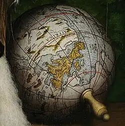 Il est orienté sur l'Europe, mise en relief par la couleur jaune. À côté des grandes capitales européennes telles que « Baris », « Roma » ou « Nureberga » (pour Paris, Rome et Nuremberg), on remarque l'emplacement de « Policy » (aujourd'hui Polisy, dans l'Aube), le domaine seigneurial de Dinteville auquel le tableau était destiné, et le centre de sa mappa mundi sentimentale[1]. La position de Jérusalem (Ierosolim) est également indiquée.